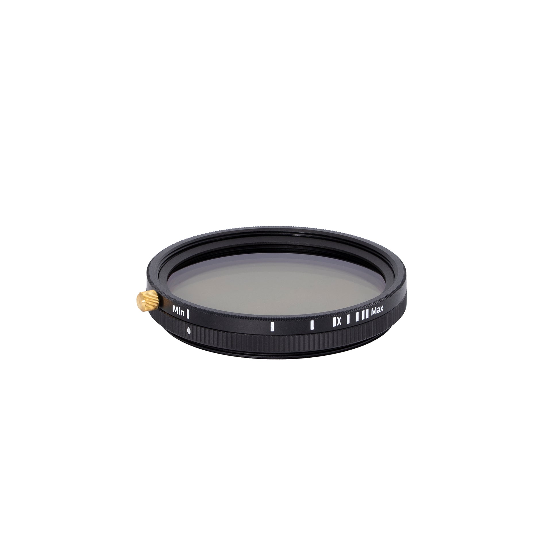 White lines on the filter's ring indicate its density setting at each full stop. These lines represent specific densities of 2, 3, 4, 5, 6, and 7 stops with 1.3 and 8 stops being achieved at each end of the filter ring's range of travel (MIN and MAX positions).