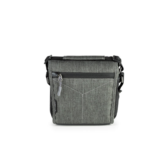 A beautiful, mottled green color, over-the-shoulder camera bag with lots of storage space for its size, and a nifty magnetic latch. This extra small size bag can hold a point-n-shoot or small mirrorless camera with 1 or 2 small lenses and accessories.