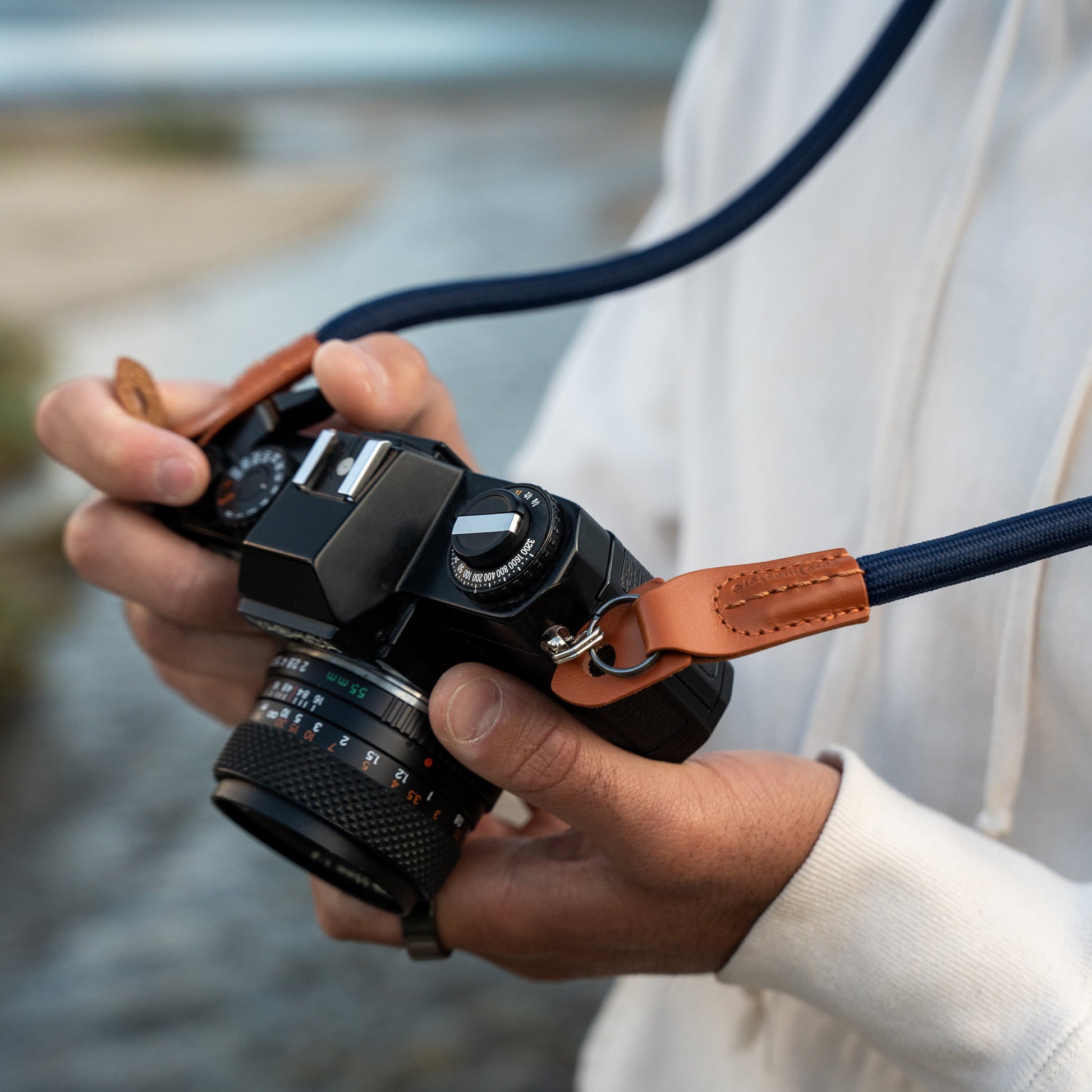 This strap connects to your camera's lugs using split ring connectors. Each connection is made through a small window in the tab at the end of the strap. This method helps protect your camera from scratches by keeping the connectors from rubbing against the camera.