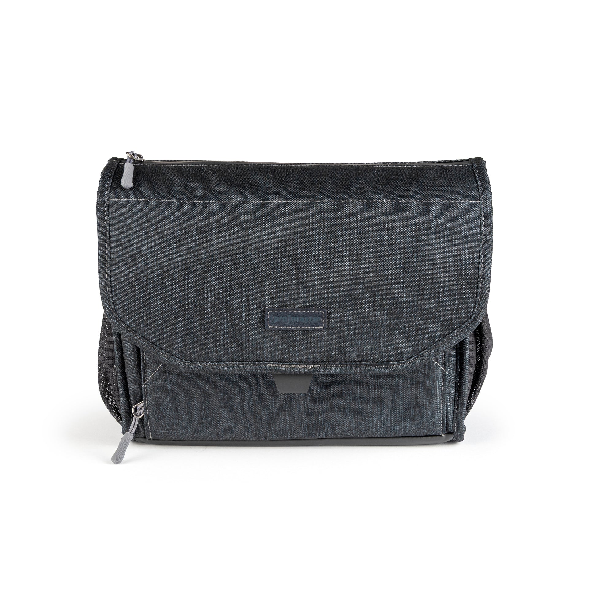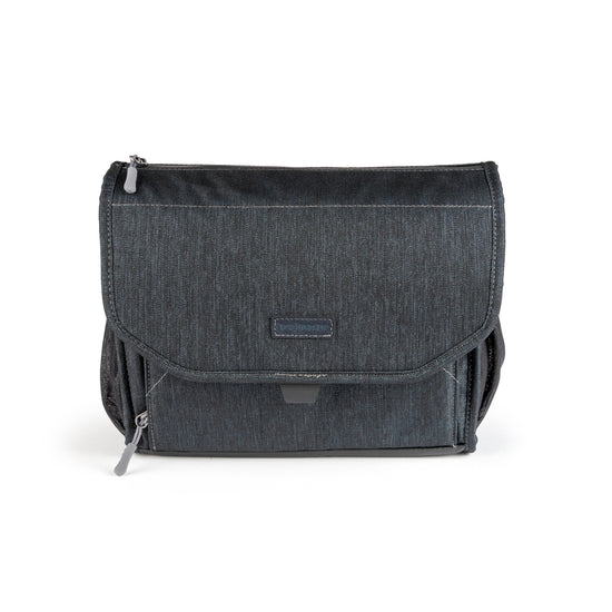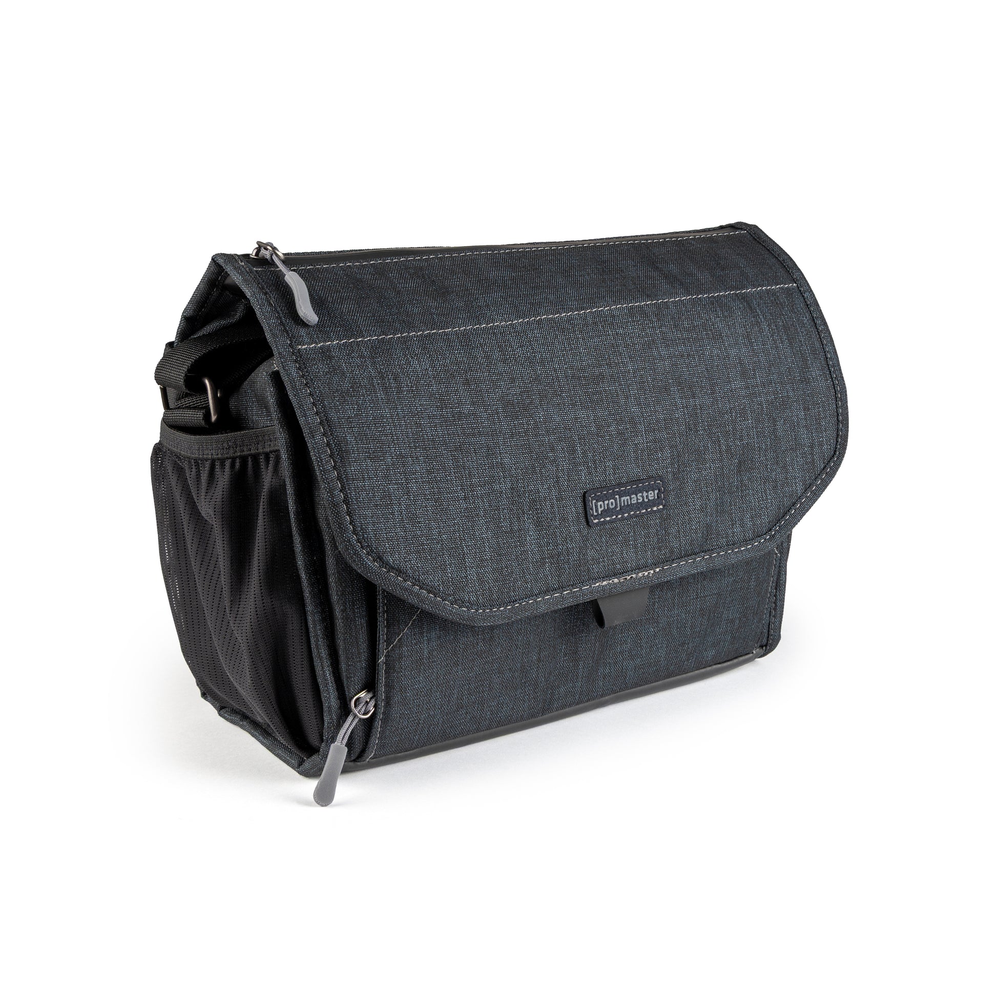 A beautiful, deep blue, over-the-shoulder camera bag with lots of storage space for its size, and a nifty magnetic latch. This large size bag can hold a mirrorless camera or DSLR with 1 to 4 lenses, speedlight, and accessories.